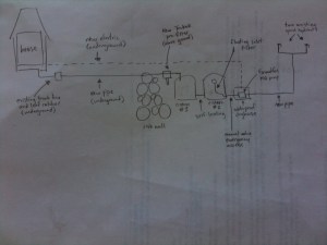 The nearby sketch shows the setup we built over the past three weeks. We’re harvesting rainwater from the roof gutters, into a “trash can” silt catcher, through to a 3P Technik VF1 Volume Filter, past a 4″ first flush diverter, and then into a pair of 2500 gallon cisterns. Extra rainfall can be diverted into an existing large diffuser once the tanks are full.
