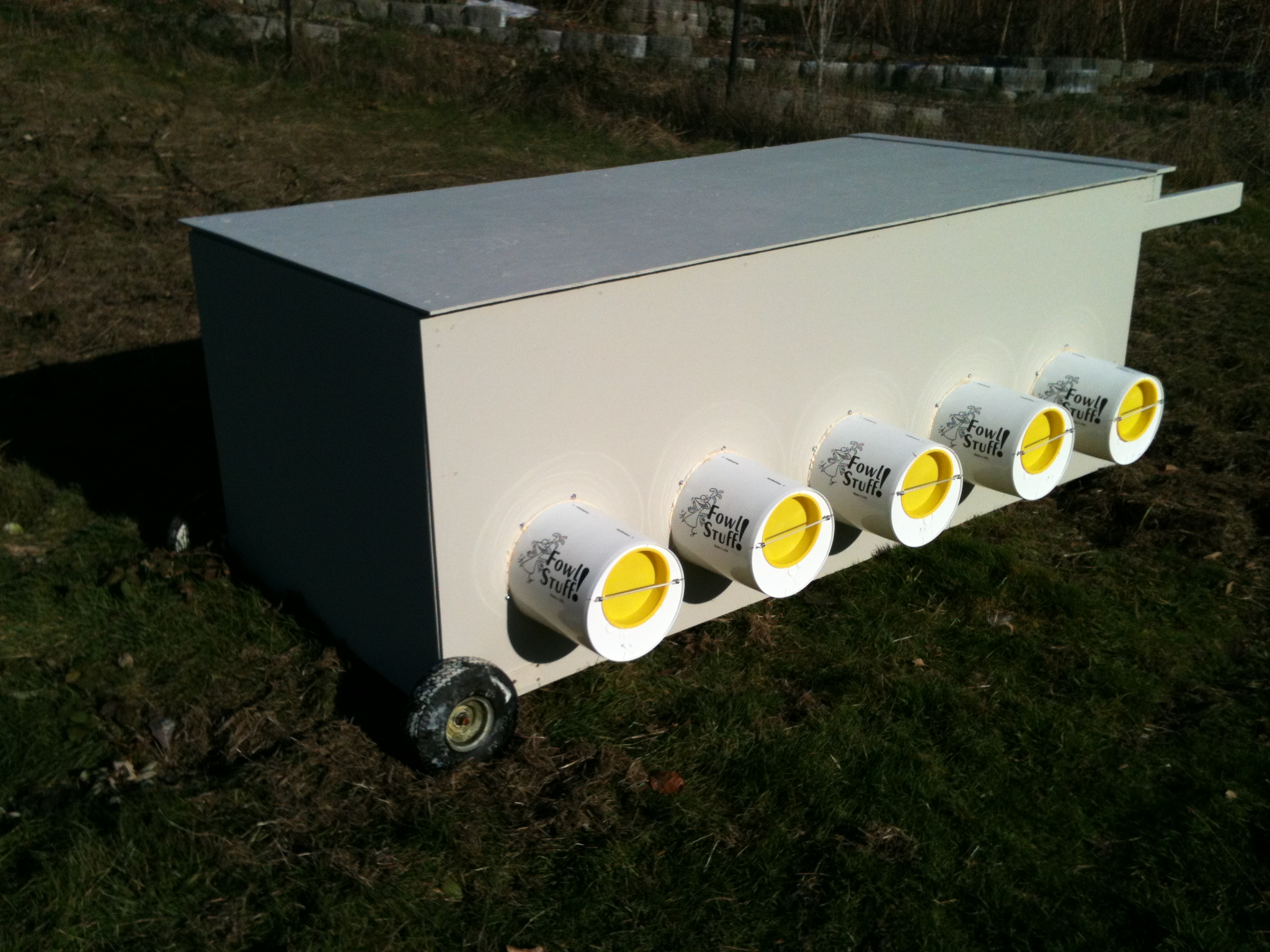 The new design features a row of nest boxes (buckets, actually) at 12″ off the ground with bamboo pole roosts 12″ above that. It was made of 50% salvage materials and 50% new materials, with cleverly designed nest buckets from FowlStuff comprising most of the new materials.